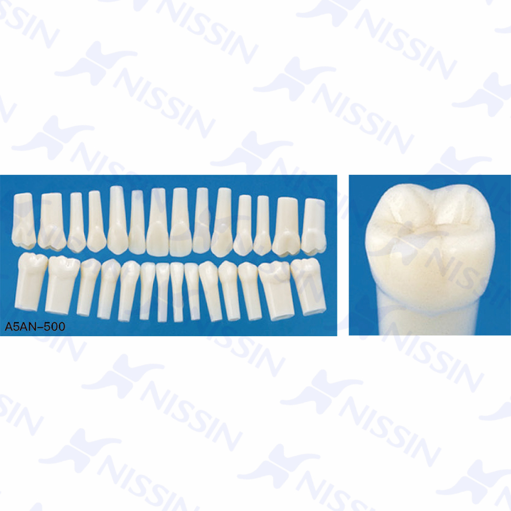 為NISSIN高級仿真頭模的選配牙齒,具有亞洲人形態的標準牙齒,共有28個牙位,牙冠具有解剖形態,帶單直根,螺紋固定非常容易安裝和拔出。可安裝在標準牙頜模型上進行牙體牙髓病或者口腔修復學的實習。