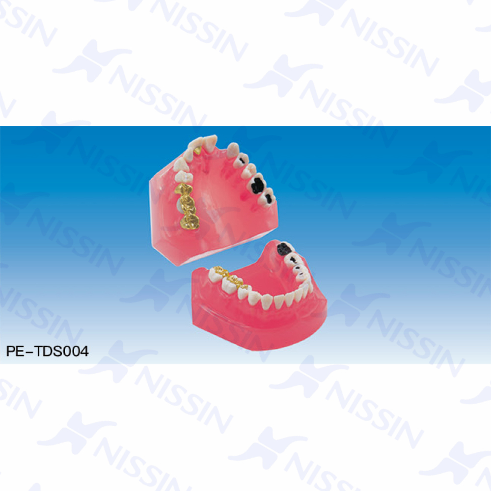 敘述齲病的相關治療計劃時,可采用本模型比較治療前與治療后的狀態,同時對治療的方案與方向性進行解說。為了能簡單地比較治療前后的狀態,右側牙列上重現了C1與C3的齲病與根尖囊腫等多種病患,在左側的同一牙位呈樹..