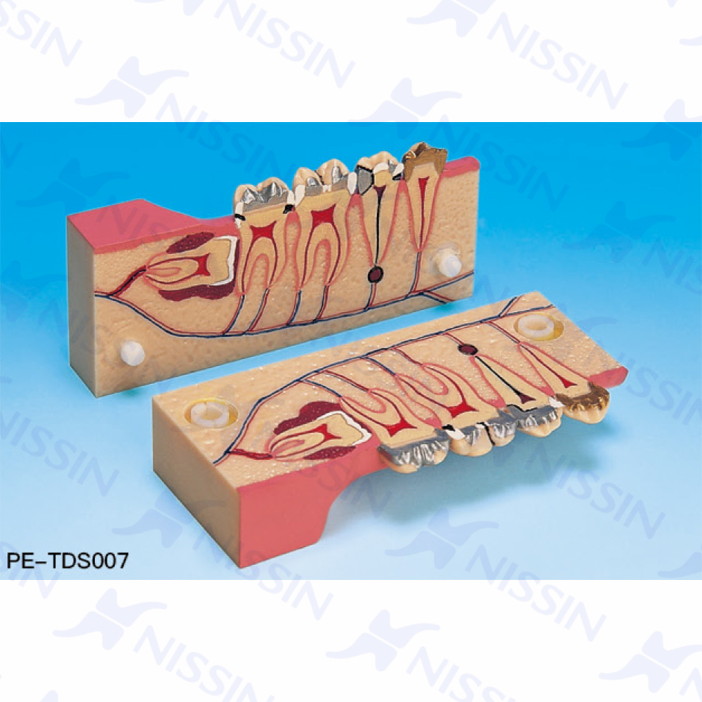 二倍自然形態大小、右下后牙近遠中垂直分解模型,展現阻生牙、膿腫、健康和病態的牙髓以及正確與不良的充填。
