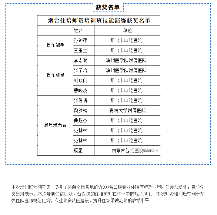 由中華口腔醫(yī)學(xué)會(huì)、中國(guó)醫(yī)師協(xié)會(huì)口腔醫(yī)師分會(huì)主辦,山東省口腔醫(yī)學(xué)會(huì)口腔醫(yī)學(xué)教育專(zhuān)委會(huì)、濱州醫(yī)學(xué)院口腔醫(yī)學(xué)院協(xié)辦,煙臺(tái)市口腔醫(yī)院承辦的“口腔住院醫(yī)師規(guī)范化培訓(xùn)師資培訓(xùn)班(2021煙臺(tái)站)”于2021年7月8日-10日..