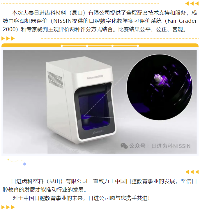 由河南省教育廳主辦,河南護理職業學院承辦的“2024年河南省高等職業教育技能大賽口腔修復工藝賽項”于2024年12月28日在河南安陽召開。日進齒科材料(昆山)有限公司為口腔修復工藝賽項提供全程的設備技術保障。本次..